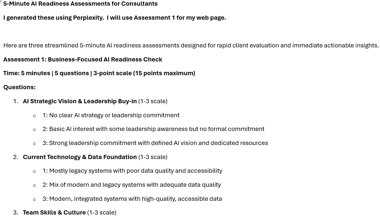 - AI Readiness Assessment: A tailored roadmap that identifies where and how your organization can begin using AI responsibly and effectively. (Sample shown at left)